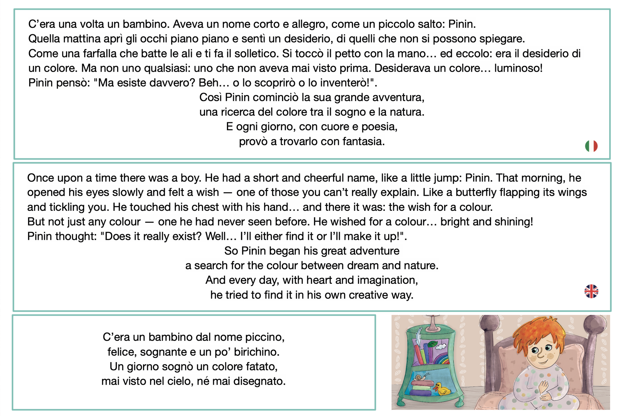 ti scrivo per presentarti “Pinin e i colori”, una storia semplice e poetica che nasce per essere letta ad alta voce, con calma e stupore. Pinin ogni giorno incontra un colore diverso e scopre che i colori non sono solo “cose da vedere”, ma emozioni da sentire: il rosso che scalda, il giallo che illumina, il blu che culla, il verde che fa respirare… fino al bianco, che contiene tutti gli altri. È un viaggio gentile sull’unicità: ognuno di noi ha dentro un arcobaleno, e quando lo abbraccia diventa luce.