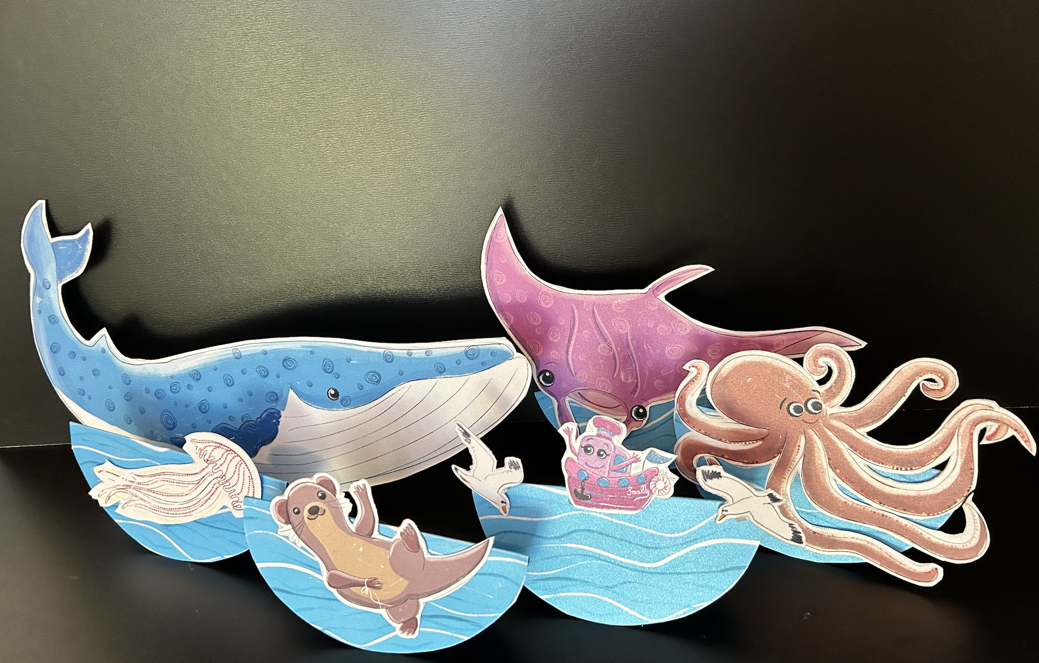 Oltre alle tavole illustrate ci sono i burattini dei protagonisti da ritagliare e un accessorio “marino” per farli navigare ondeggiando lentamente.
